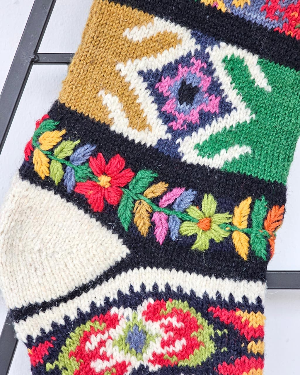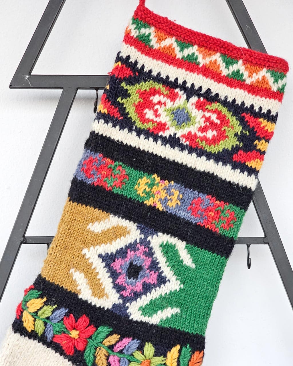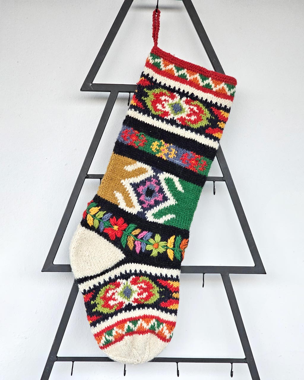 A joyful, artisan-made Christmas Holiday Stocking in a Bosnian traditional design. Made of sustainable wool. Size: 59 cm ร 18 cm (23.25 in ร 7.1 in).