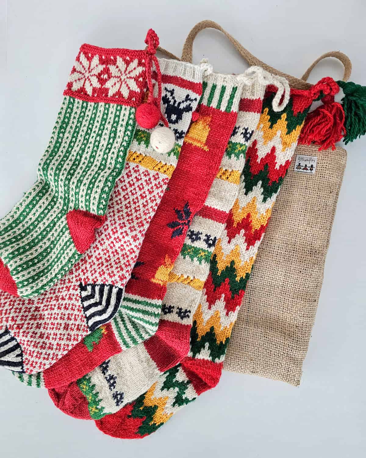 Bulk of 5 handmade Christmas stockings in colorful knit patterns. Fair-trade, eco-friendly, and also gift-ready for families, friends, or your holiday décor. Stockings are in various sizes.