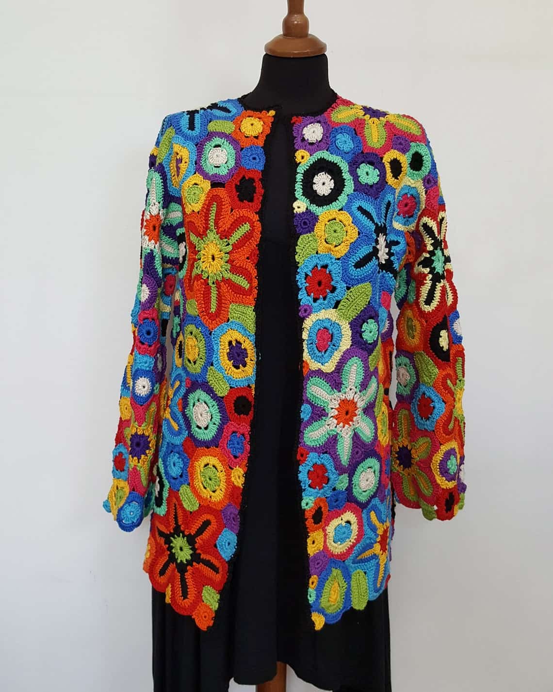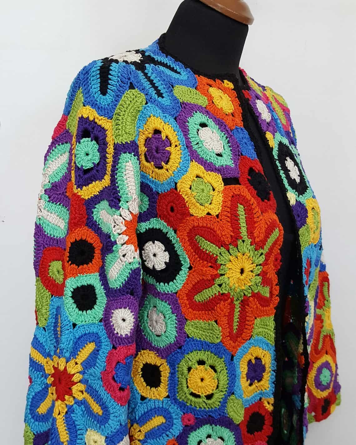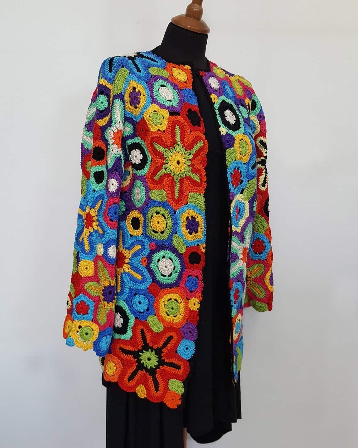This is a handmade piece that will turn heads anywhere you go. It is made with crocheting technique, thus creating a jacket that is a true stunner.