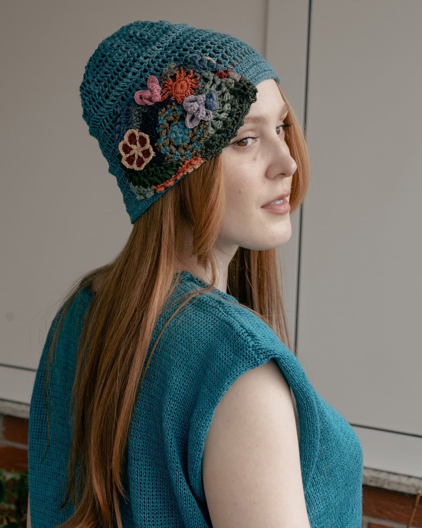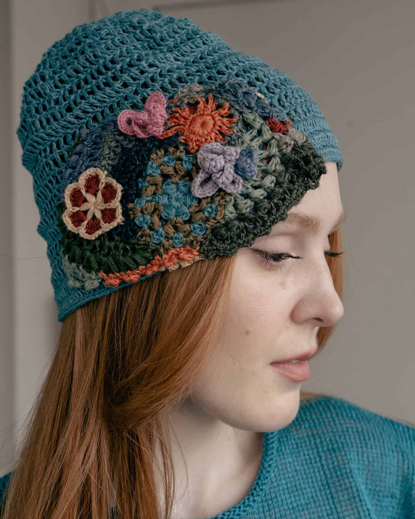 Crocheted cap, which will attract the attention of the surroundings. Universal size, which fits to head circumference from 52 cm to 62 cm