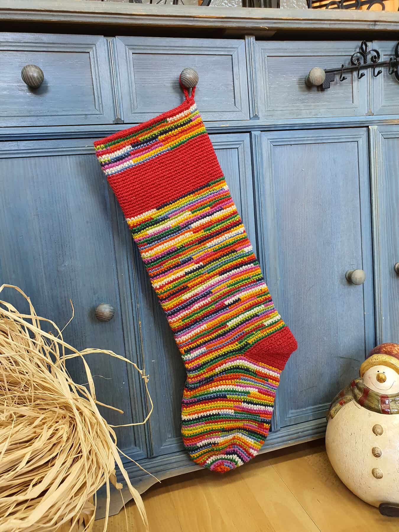 Enhance the festive tree display with these timeless designs, an eco-friendly Crocheted Christmas Stockings, Personalized striped design.