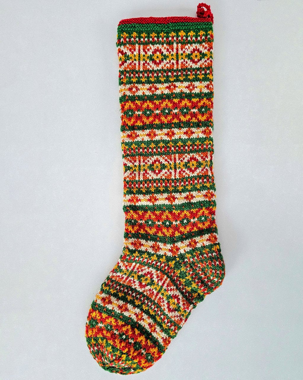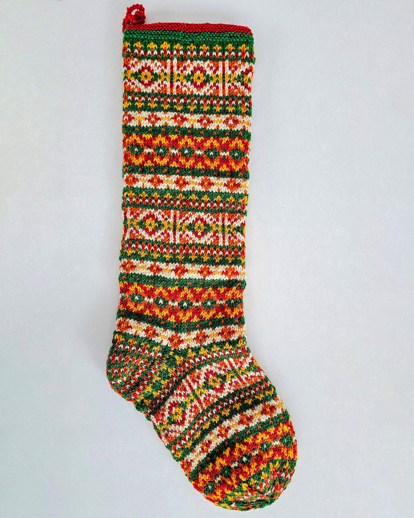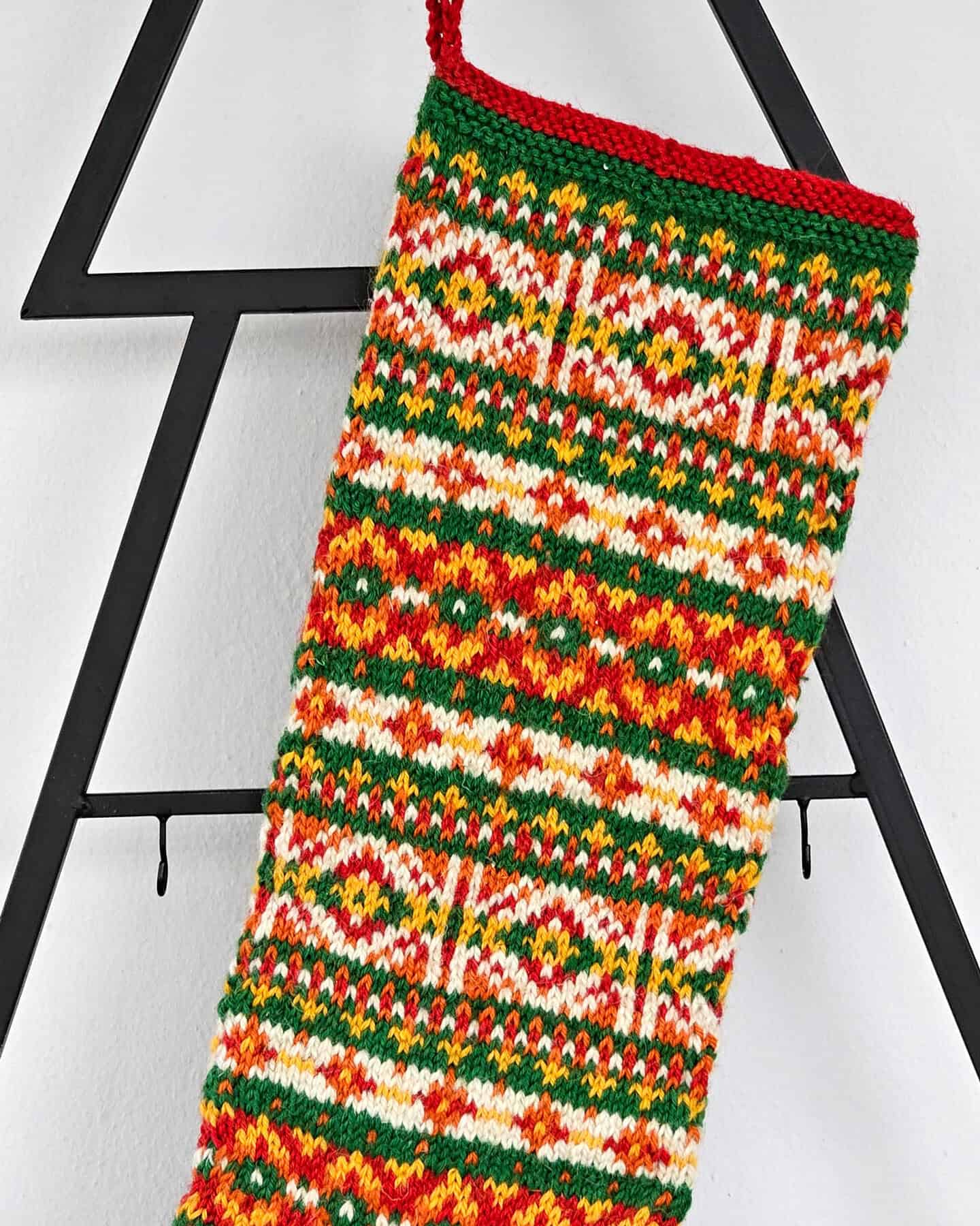 A vibrant Fair Isle–style, fair-trade stocking hand-knit in red, green, white, and gold. Crafted from sustainable yarn and WFTO-certified artisans. Size: 24.8″ × 7.1″ (63 cm × 18 cm).