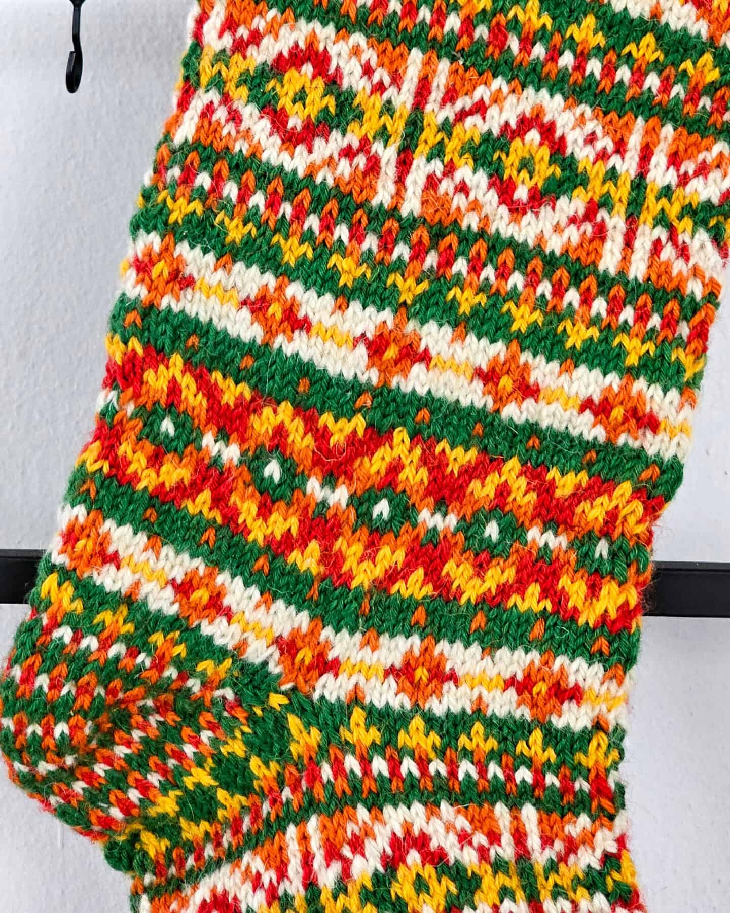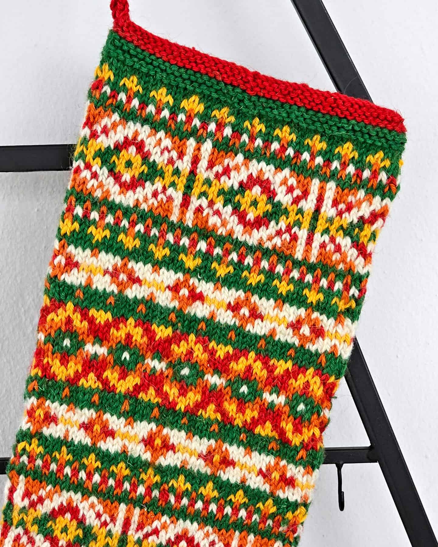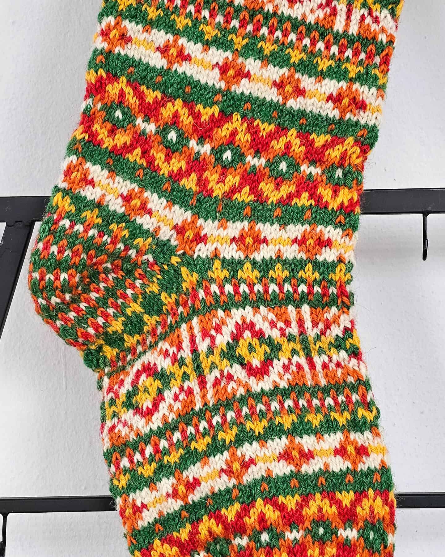 A vibrant Fair Isle–style, fair-trade stocking hand-knit in red, green, white, and gold. Crafted from sustainable yarn and WFTO-certified artisans. Size: 24.8″ × 7.1″ (63 cm × 18 cm).
