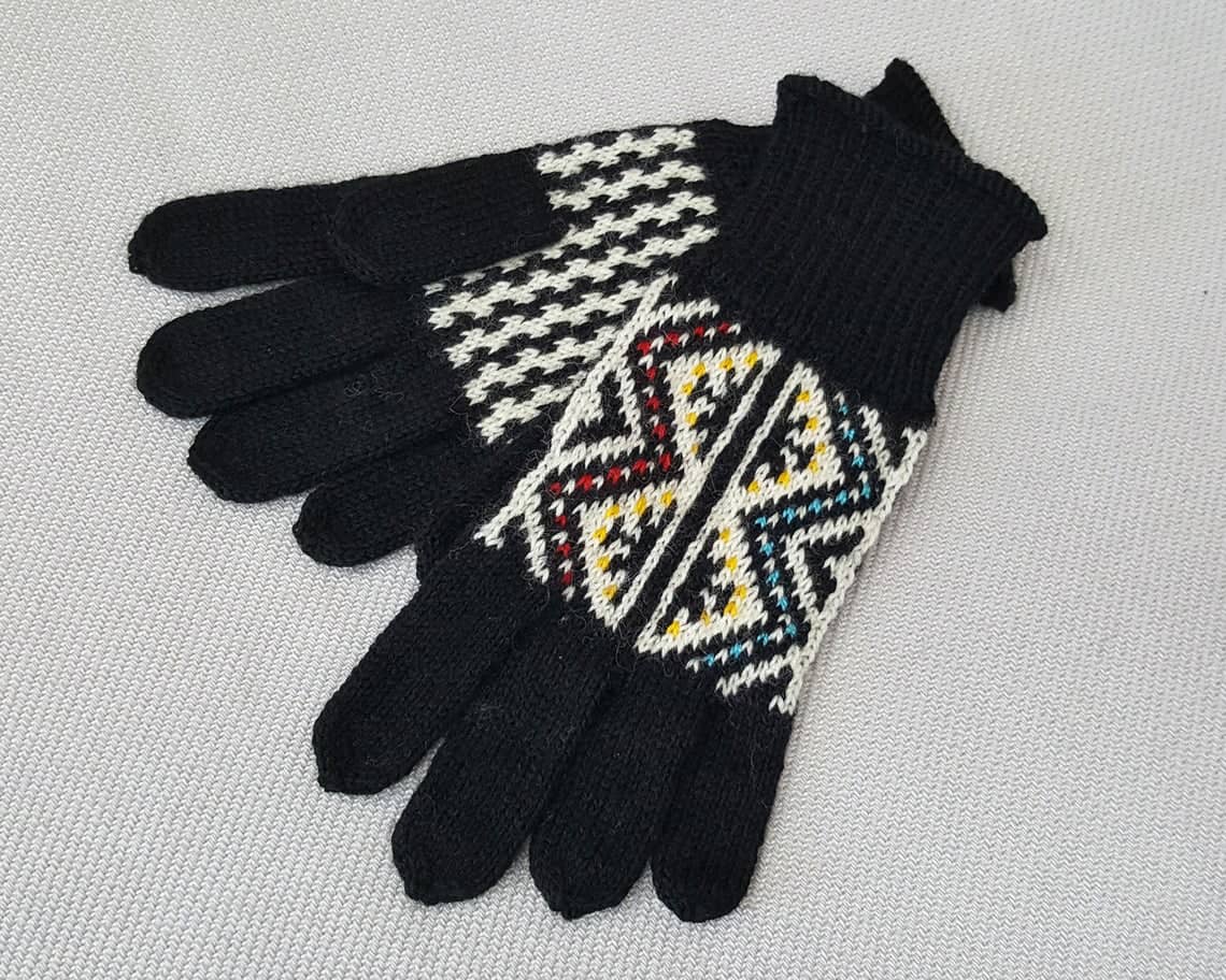 Keep your hands protected and add an elegant detail to your cold weather style with a black pair of hand knitted gloves done in jacquard traditional Bosnian pattern. Great for skiing, snowboarding, ice skating or any winter sports or cold weather situation. They are handmade with great care, in a smoke-free, pet-free home. 70% wool and 30% acrylic.