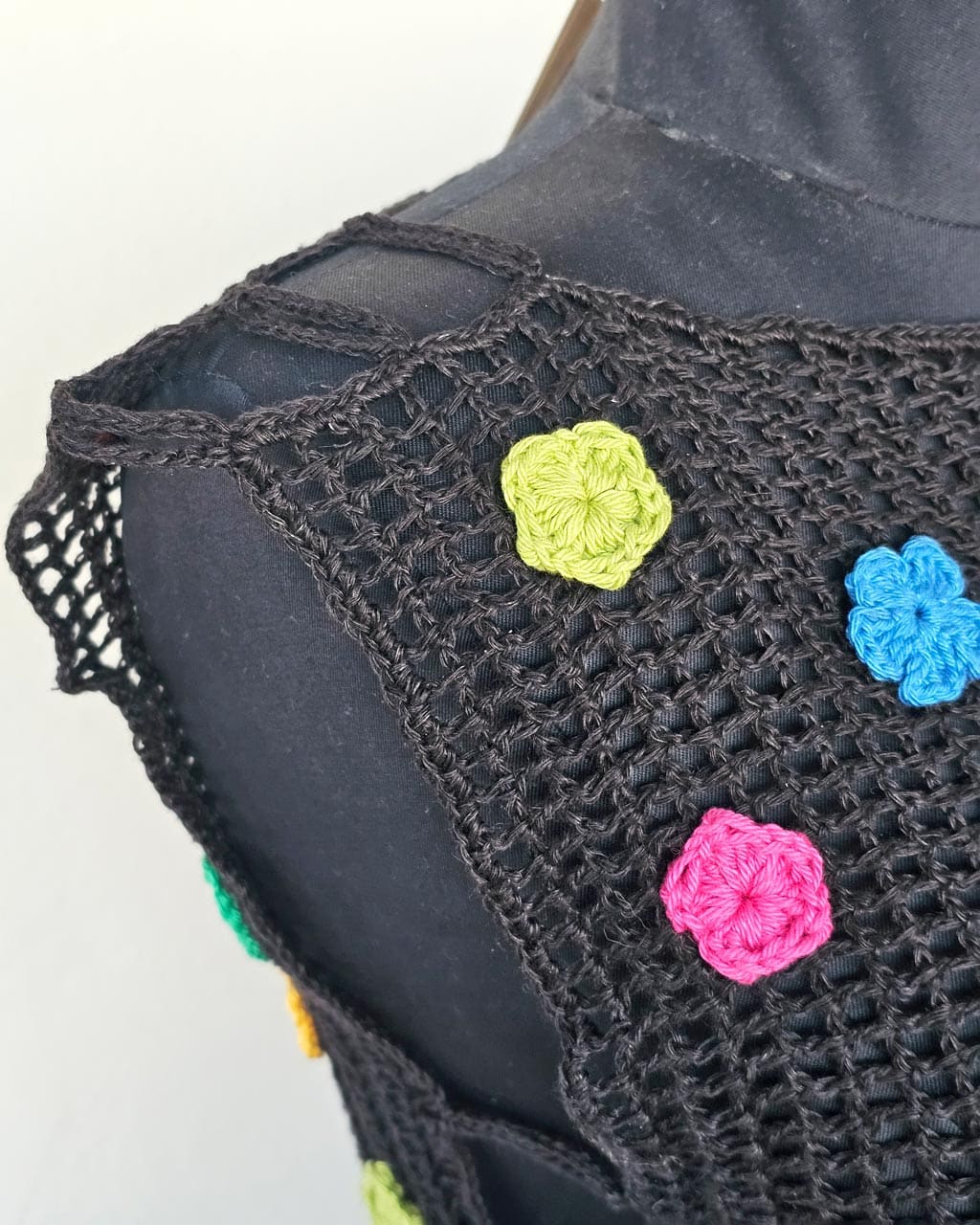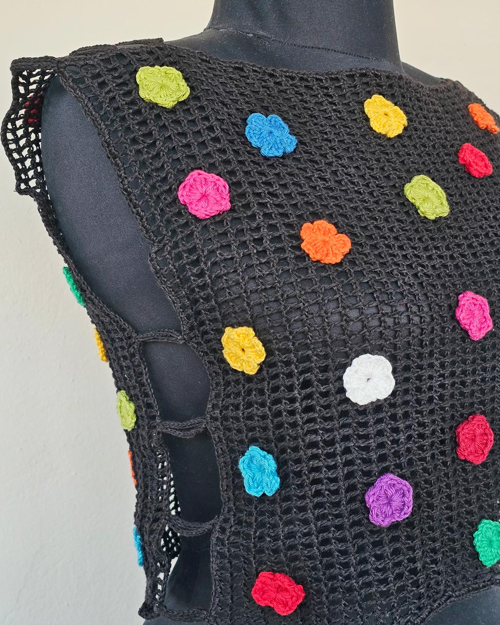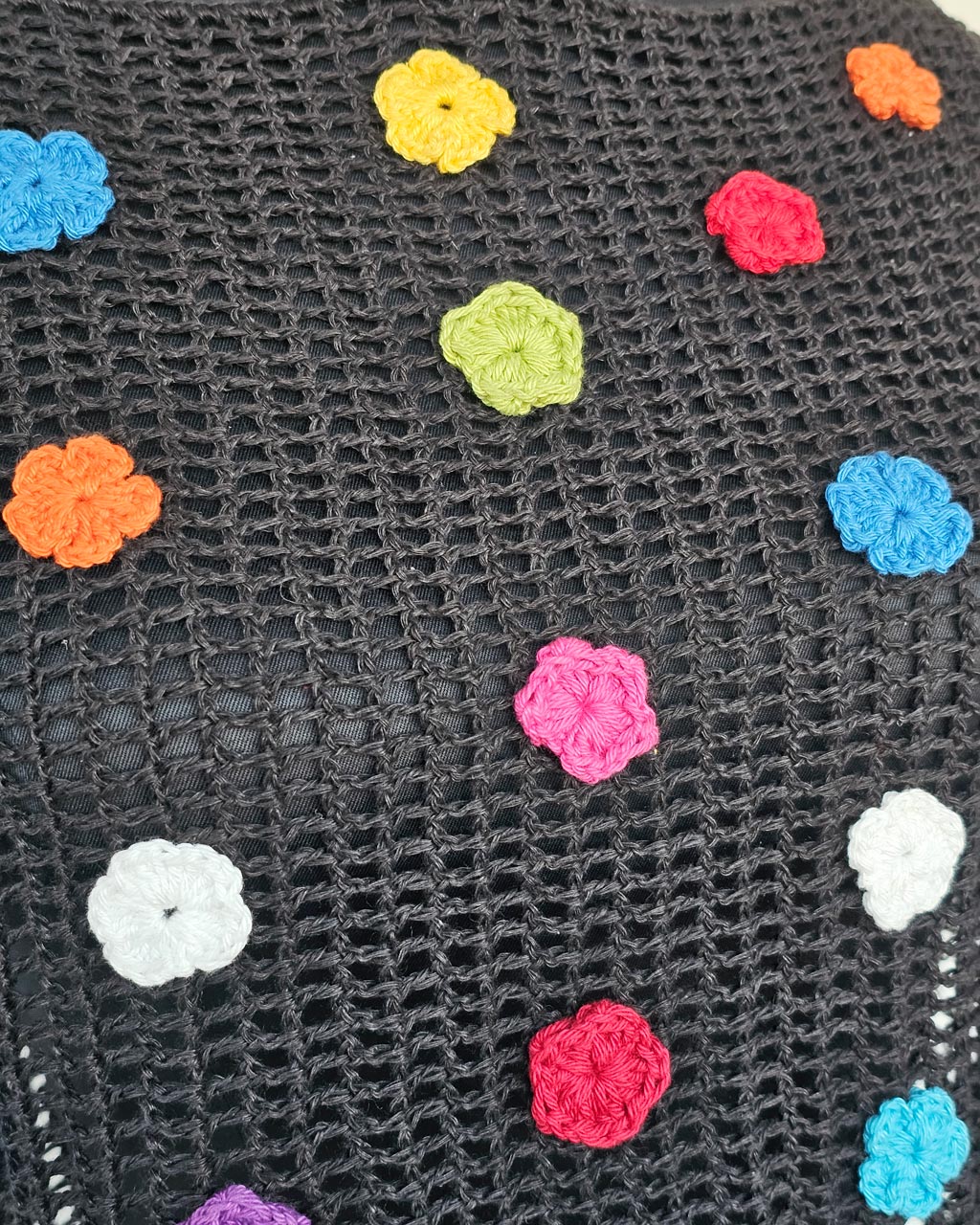 This woman’s hand crocheted blouse brings color and texture into your wardrobe. The design features small floral motifs joined into a rich pattern. Each flower uses soft yarn in warm and natural tones, which creates a balanced and eye-catching look.