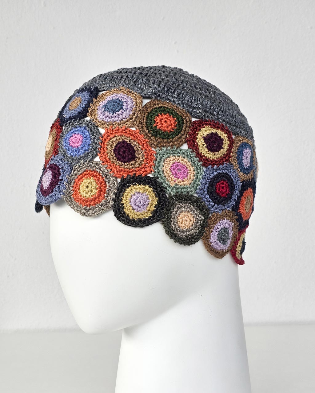 Hand crocheted linen hat with a colorful circle pattern. Lightweight, breathable, and comfortable for everyday wear. A unique handmade accessory with natural texture and artistic design.
