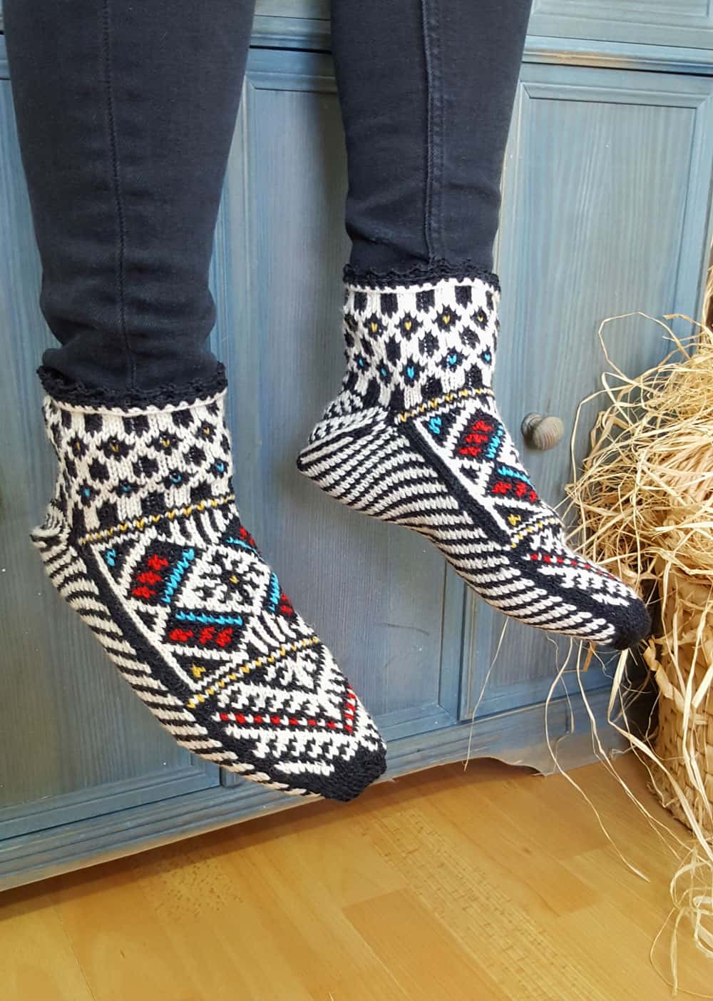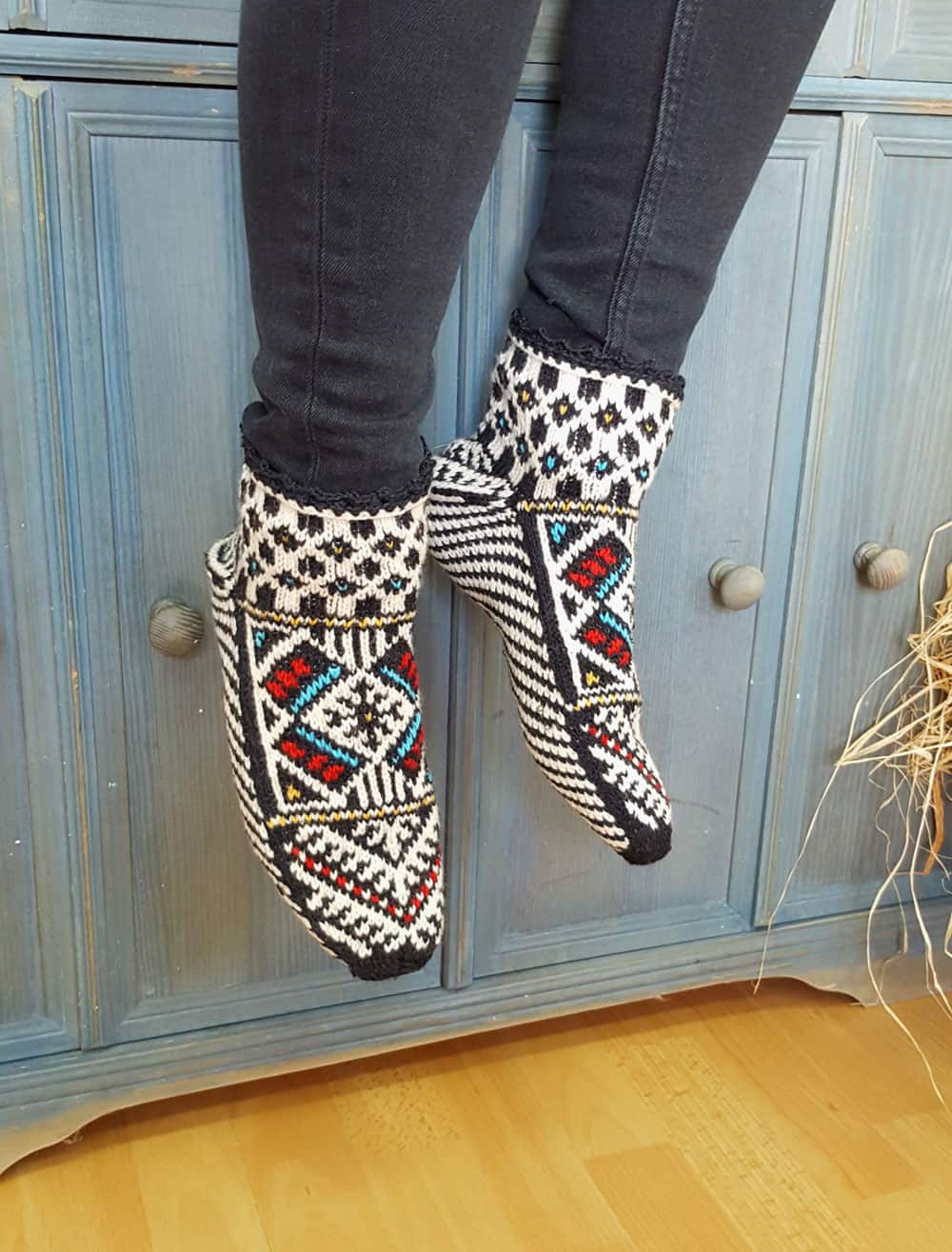 These hand-knit slipper socks (artisan-made) bring comfort but also heritage to your home. BHcrafts artisans create each pair with precision and skill. These artisan handmade slipper socks follow a traditional Bosnian pattern in black, white, red, blue, and yellow. The wool blend keeps your feet warm but also cozy. The fit stays firm without pressure, additionally, they are Fair Trade handcrafted slipper socks.