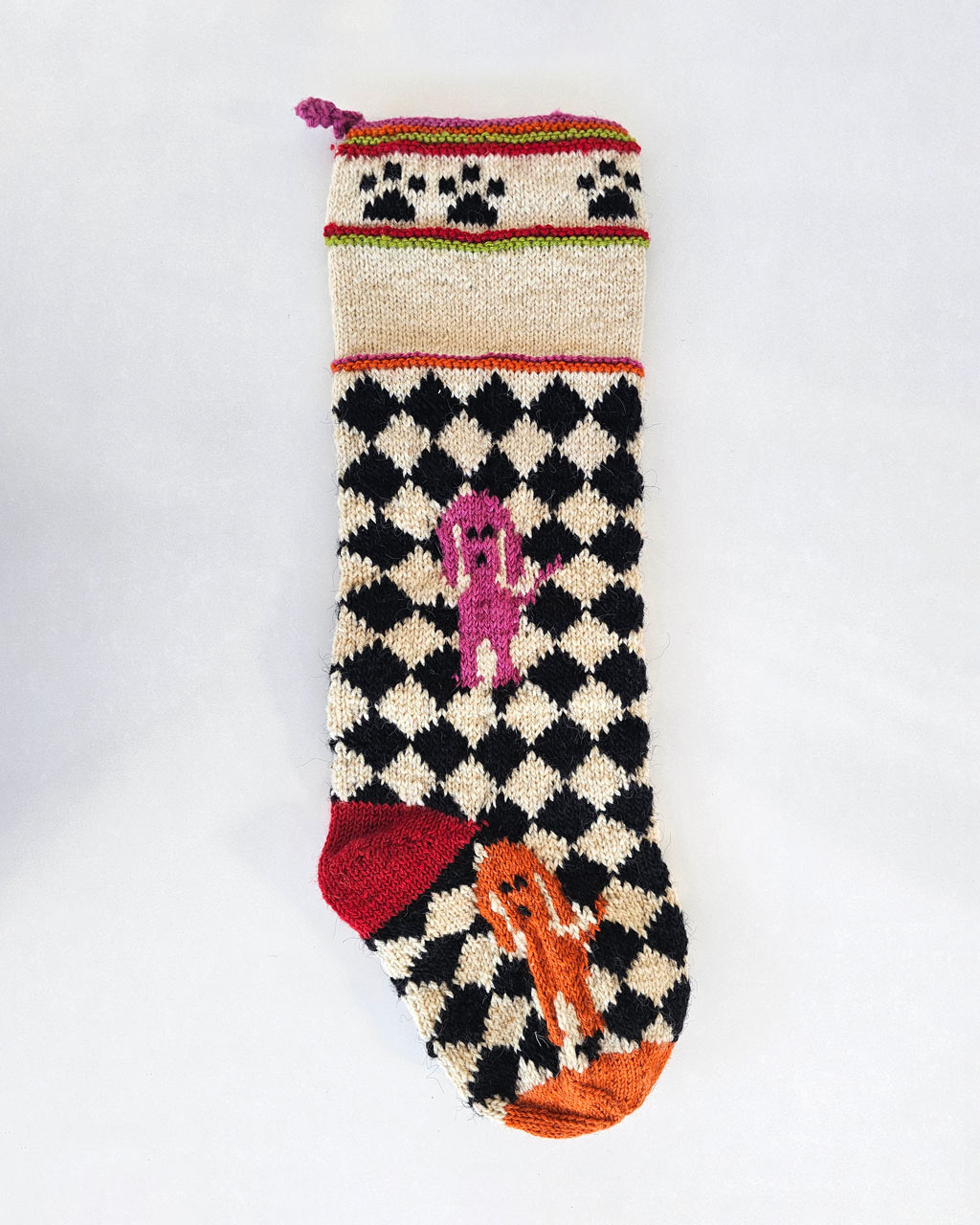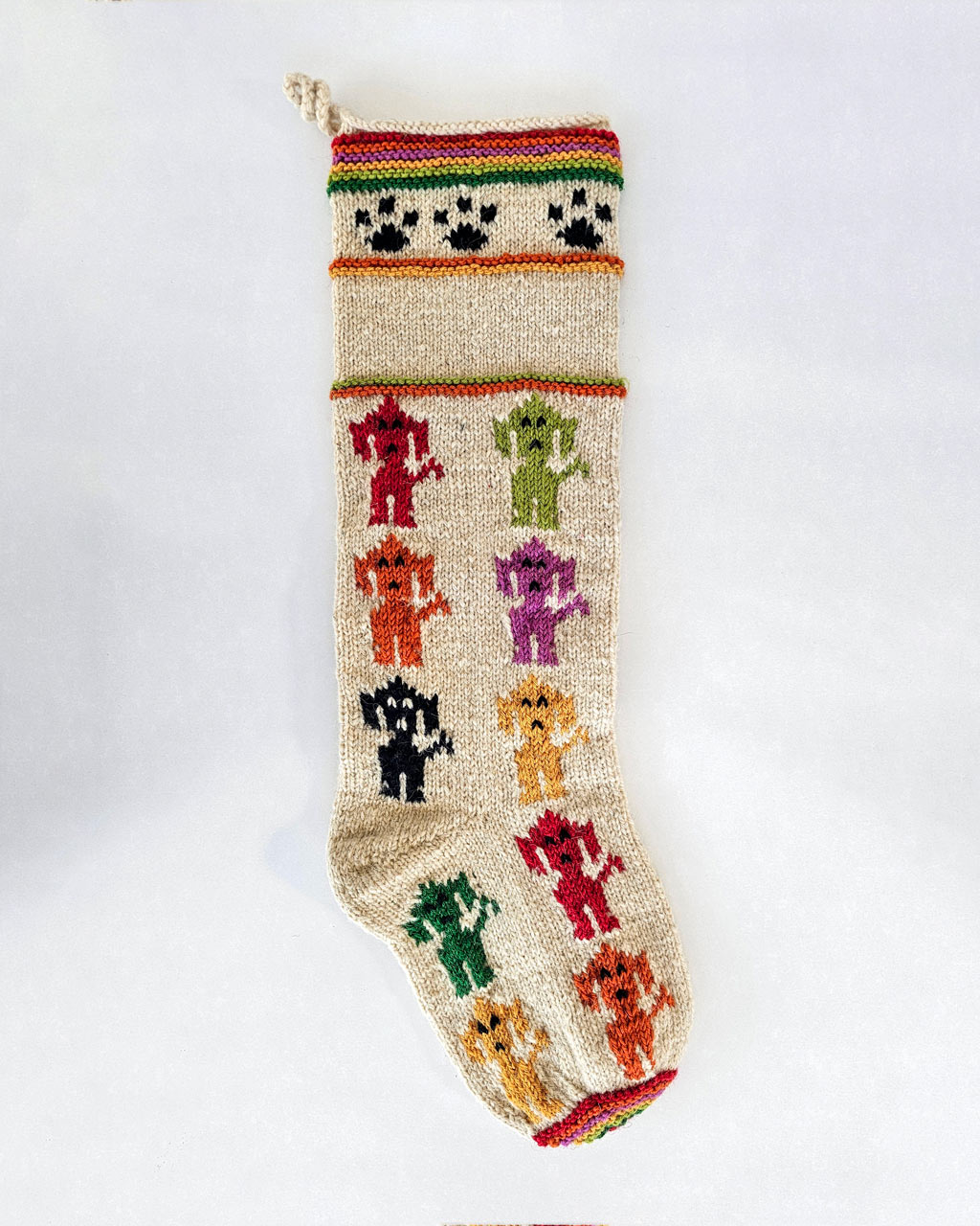 Add a playful touch to your holiday décor with this fair-trade, handmade set of two Christmas tree stockings for dogs. Each stocking features colorful knitted dog motifs, but also geometric patterns. Handcrafted set of holiday Stockings for dogs from soft wool, also artisan-made, these Christmas stockings are perfect for filling with pet treats and toys.