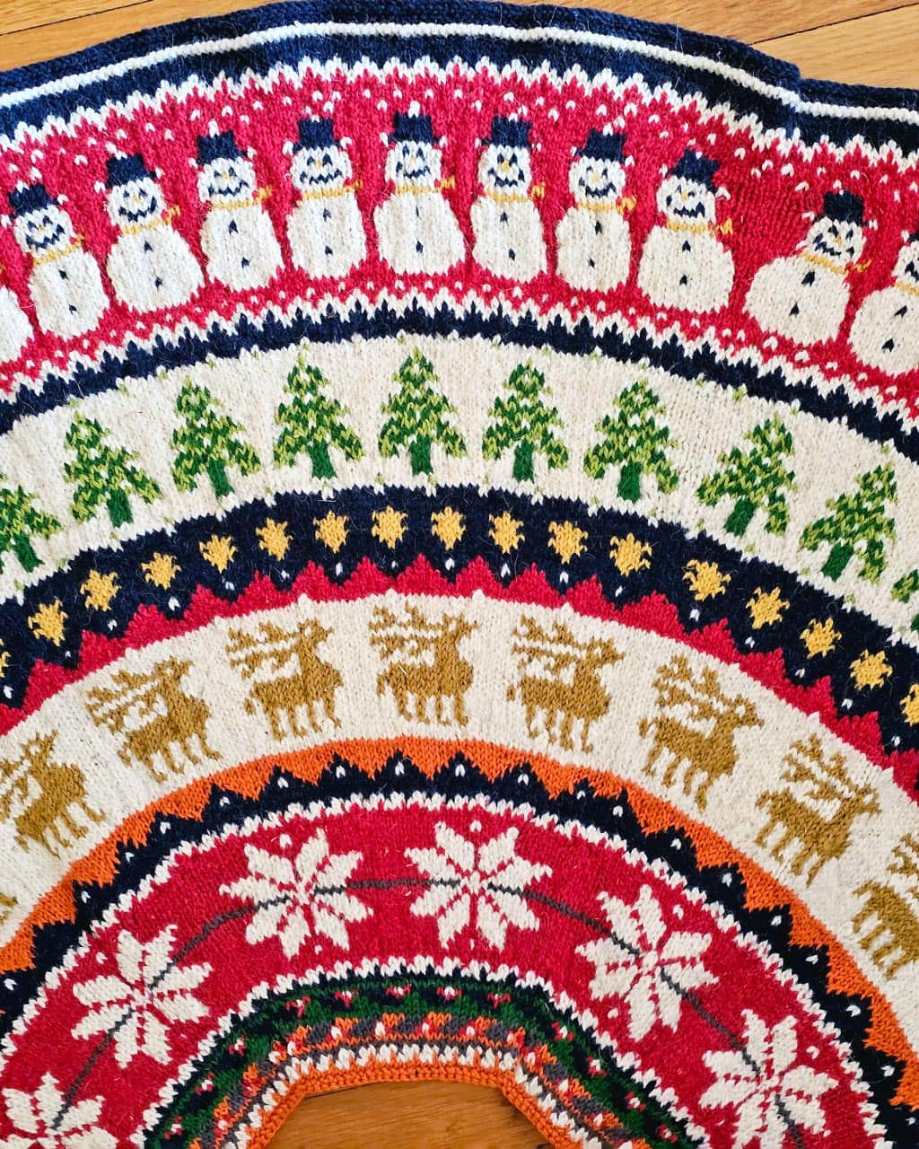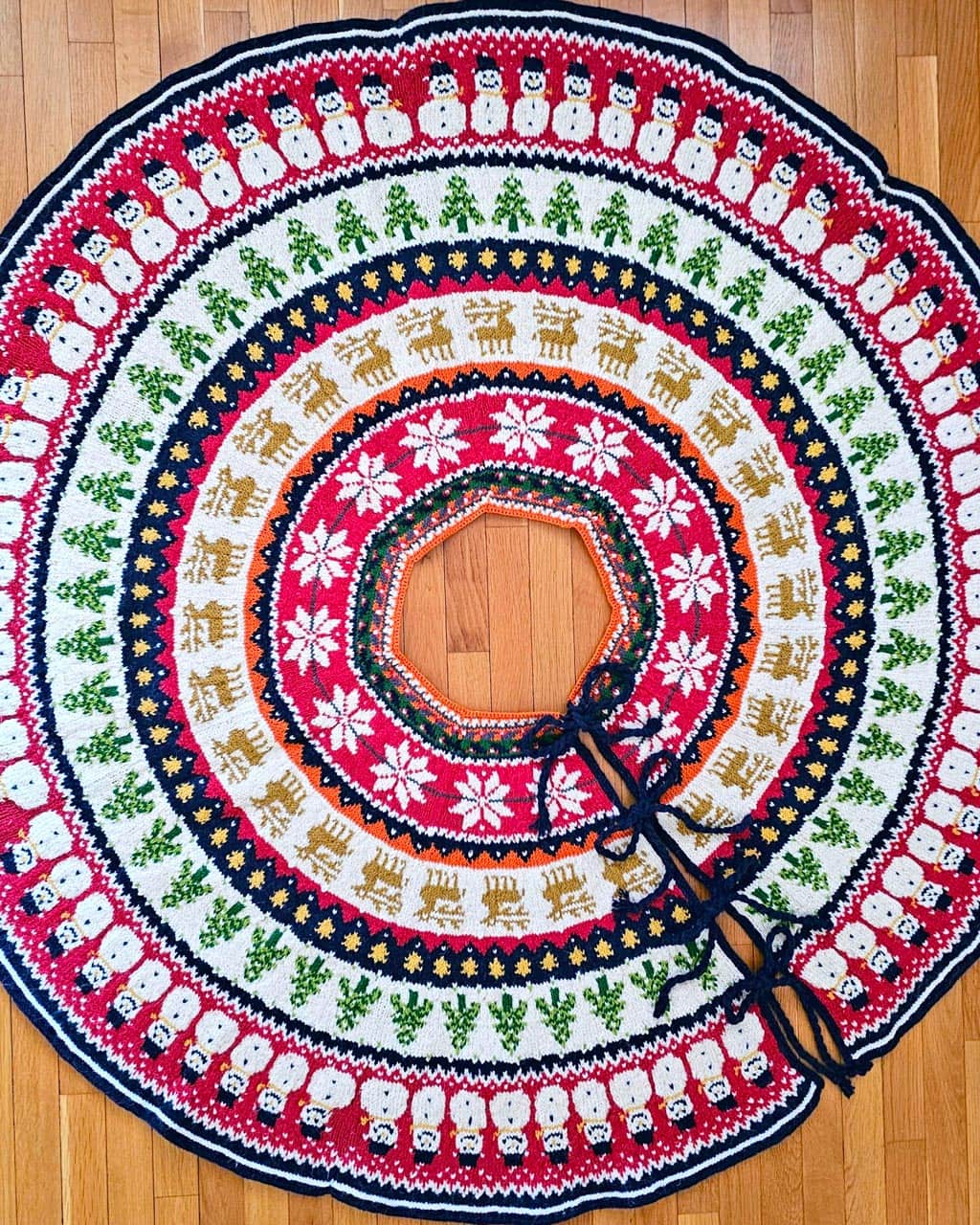 This handmade Christmas tree skirt adds color and detail to your holiday setup. The design features rows of snowmen, Christmas trees, reindeer, and snowflakes. Each pattern forms a clean circular layout that draws the eye.