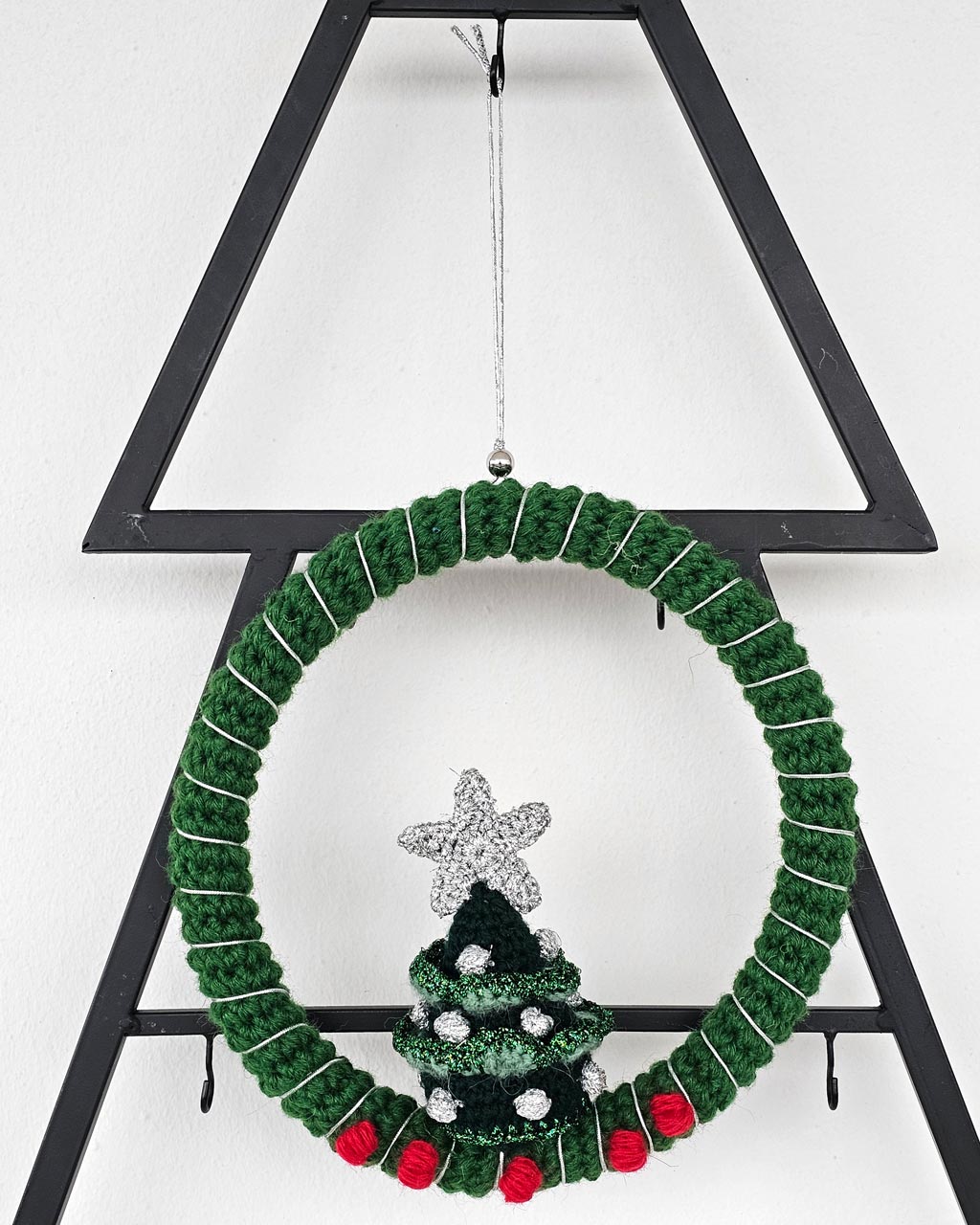 Handmade crochet Christmas wreath with green yarn base and decorative tree detail. Lightweight, festive, and easy to hang on doors or walls.