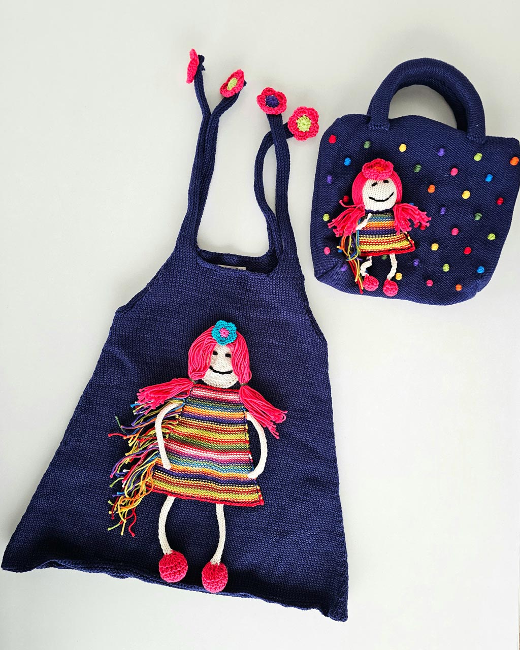 A handmade girls’ dress and matching purse set with a playful doll appliqué. Soft knit texture, bright colors, and a fun design make this set perfect for everyday wear or special outings.
