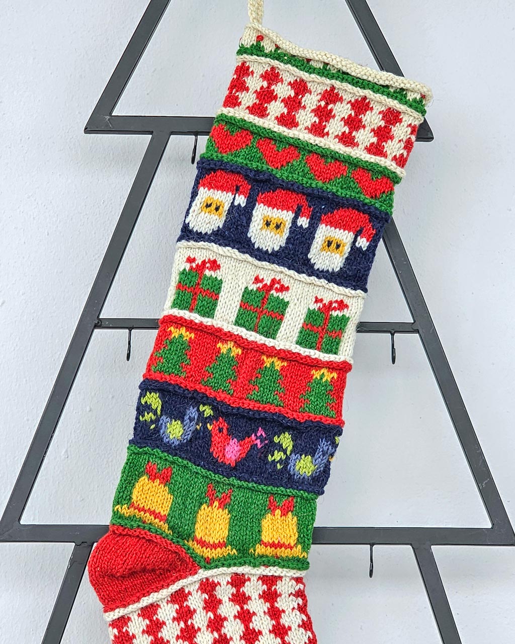 Festive patchwork stocking with classic Christmas motifs. Size: 25.6in x 7.00in (65cm x 18cm). Made of sustainable wool. Fair Trade and eco-friendly gift wrapping. Size: 25.6in x 7.00in (65cm x 18cm).