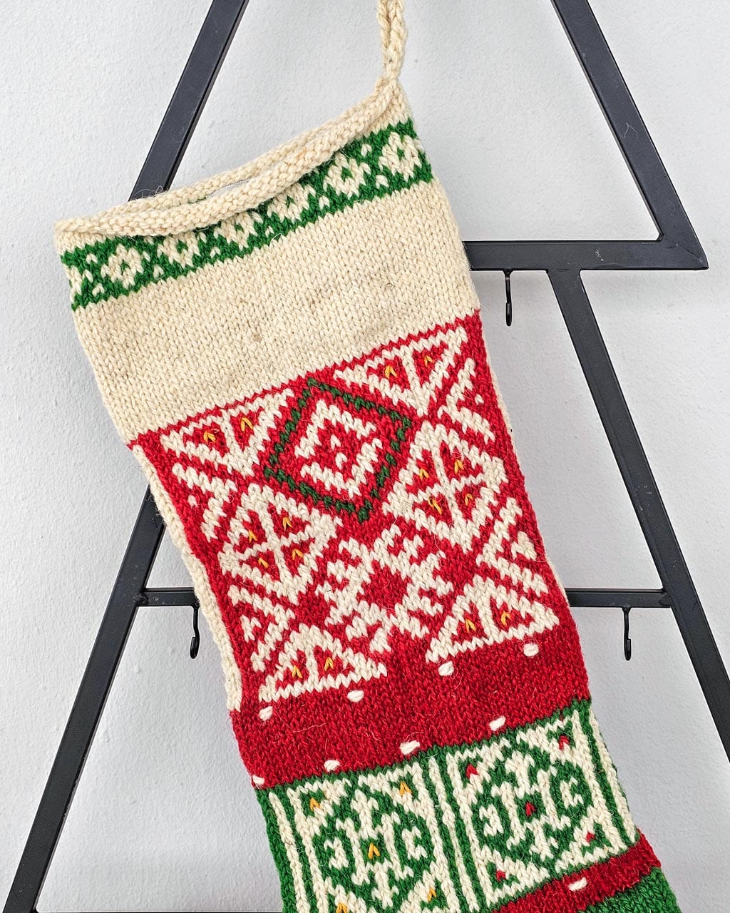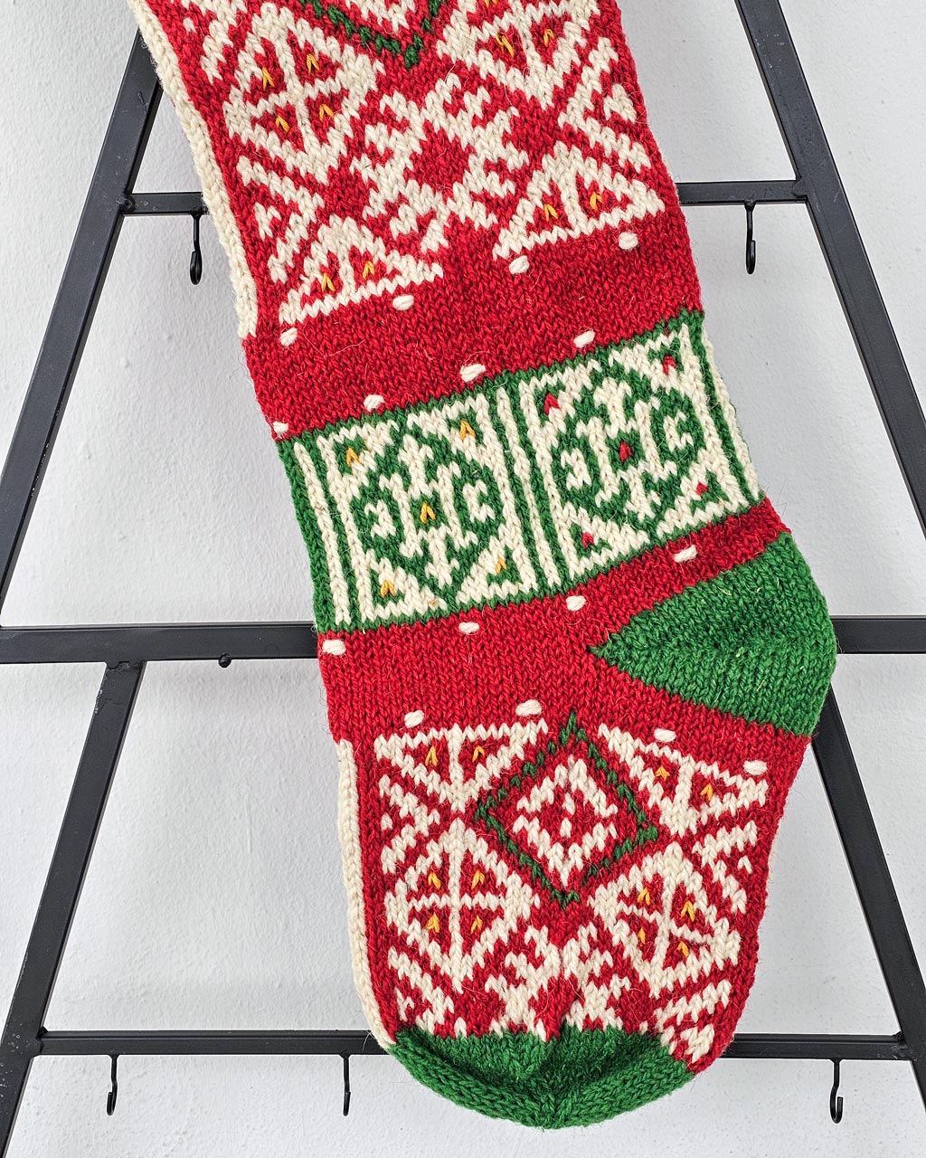- Intricate Multicolor Craftsmanship: Rich reds, greens, and creams, as well as vibrant highlights, combine into an eye-catching stocking.
