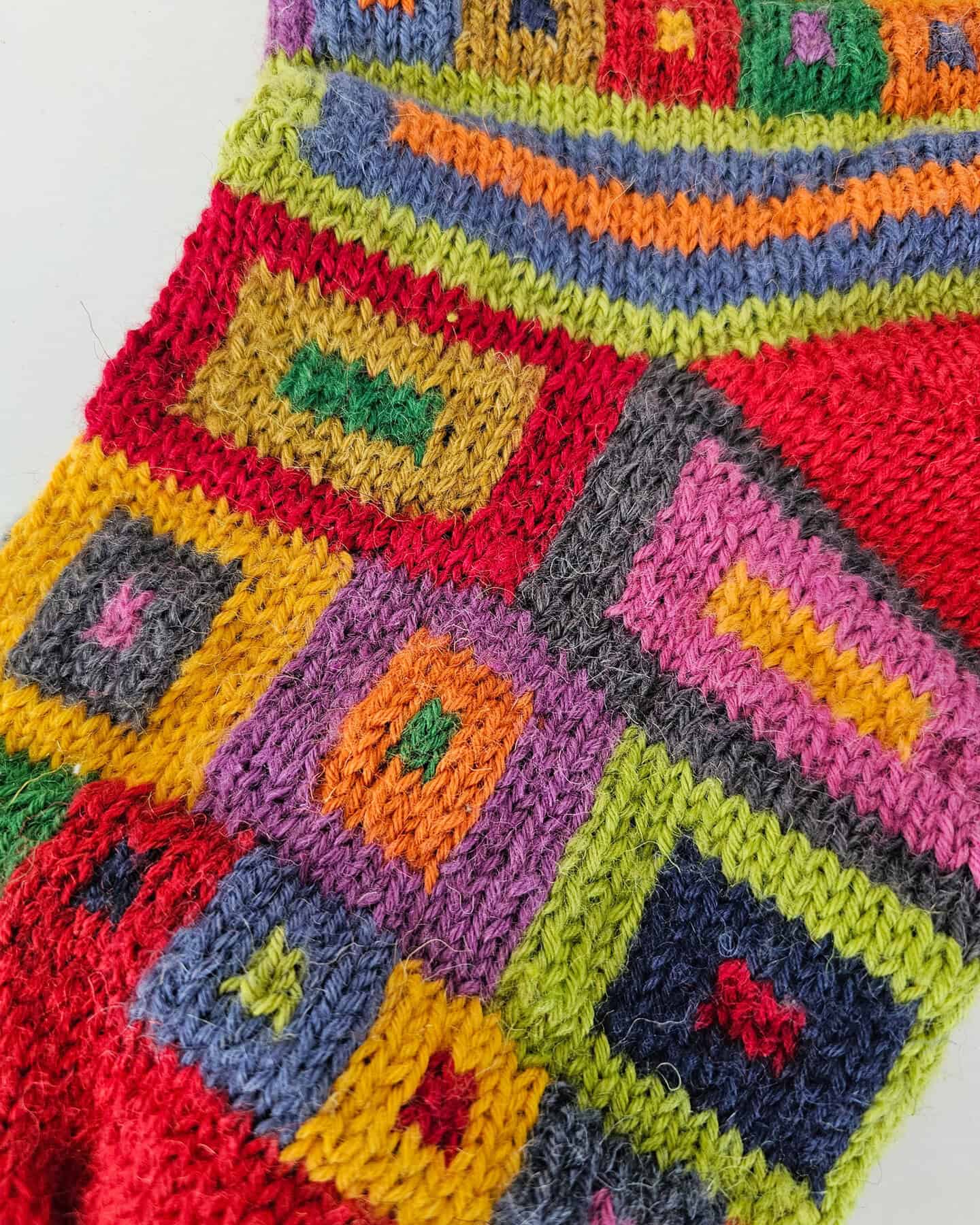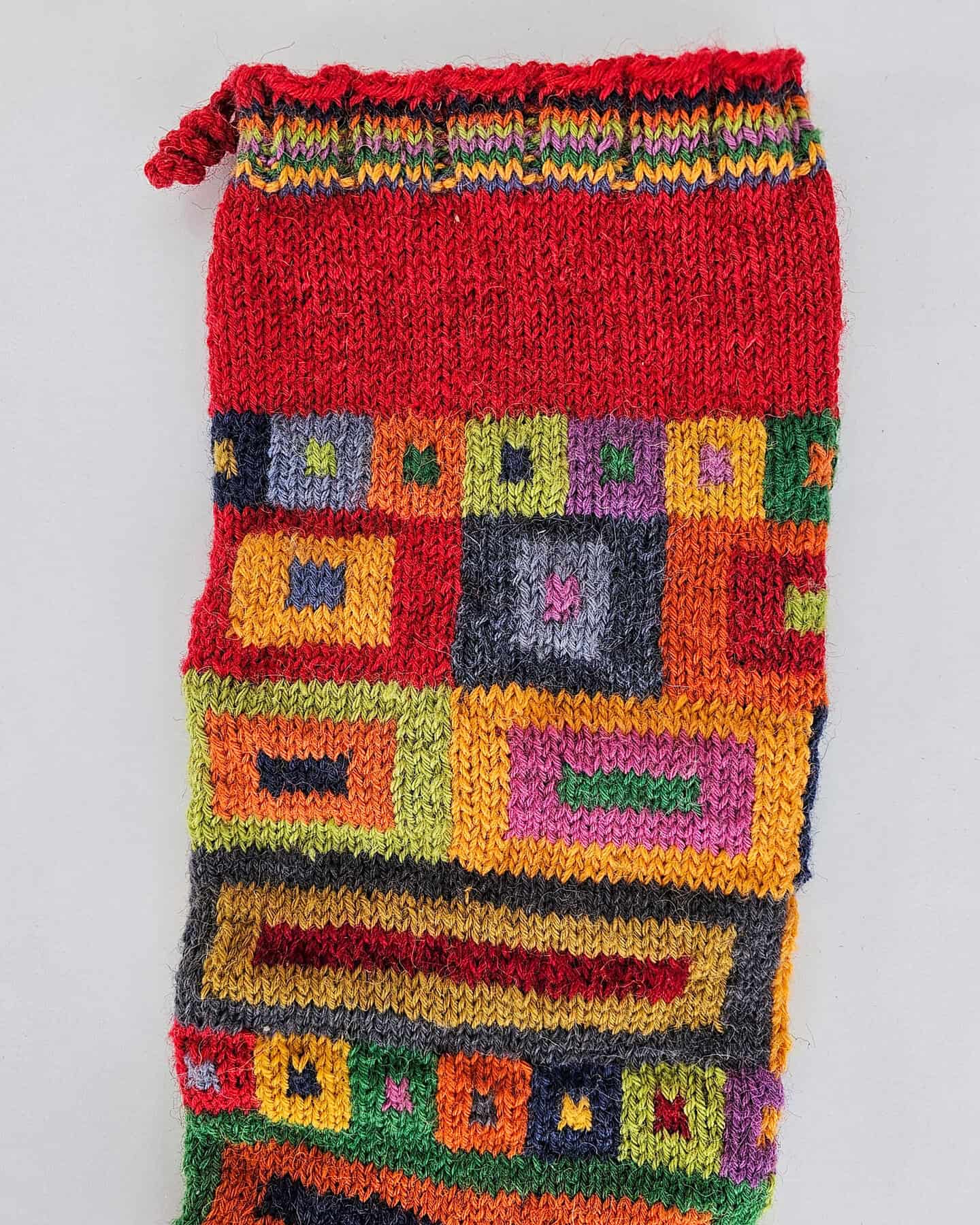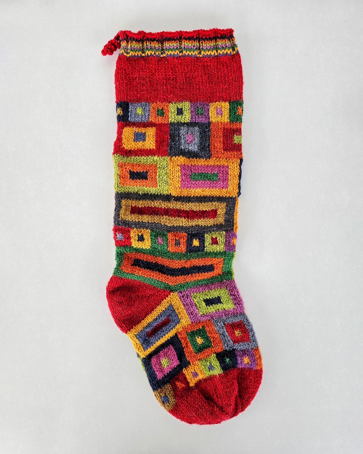 Brighten up your holiday season with this hand-knitted Christmas stocking featuring an eye-catching geometric pattern of vibrant squares as well as rectangles. Each piece is carefully handmade by BHcrafts women artisans, providing unique quality and character.