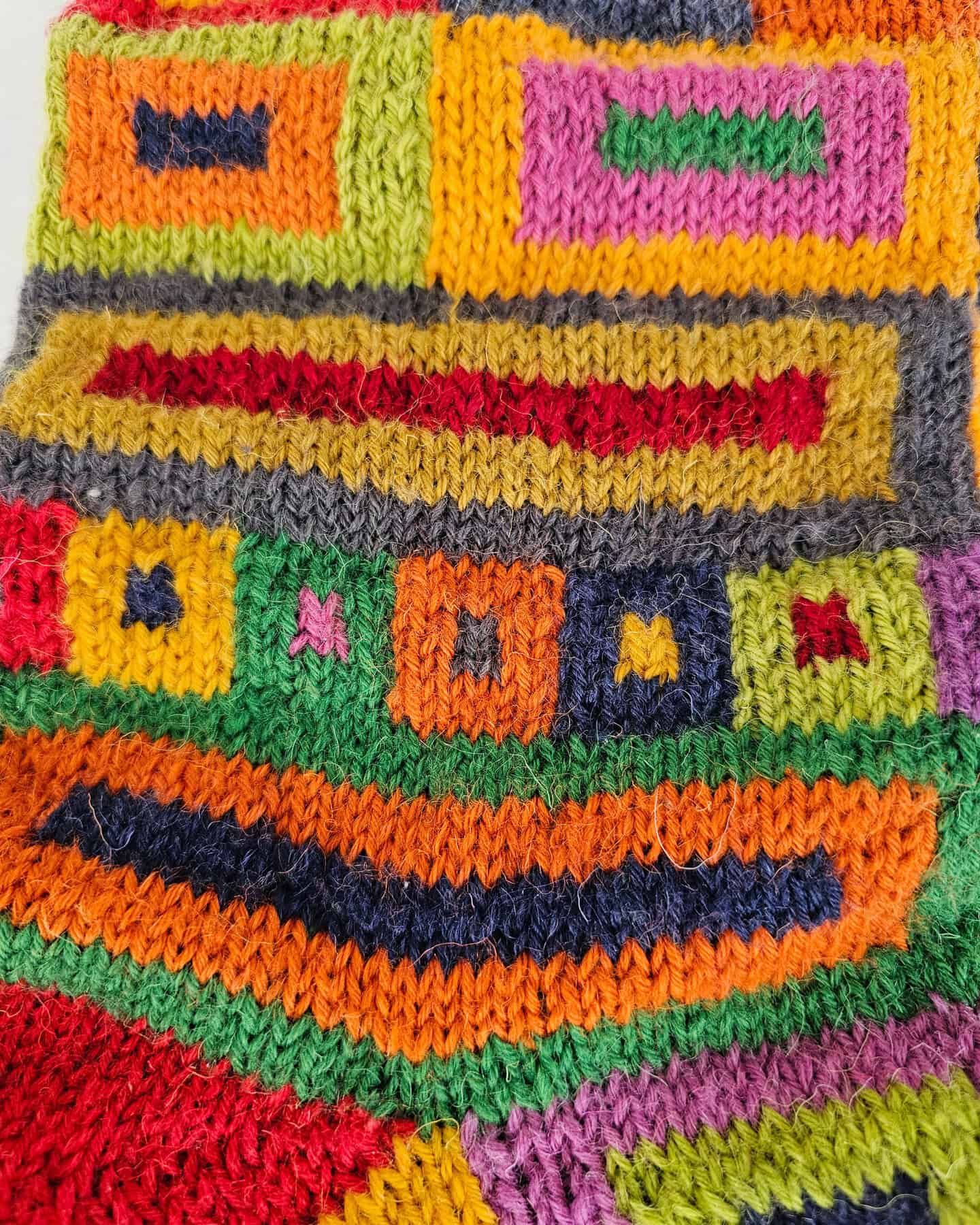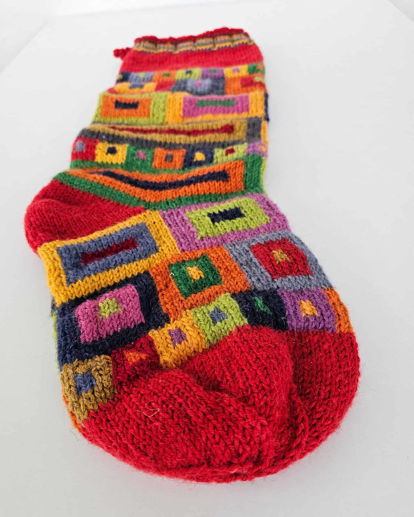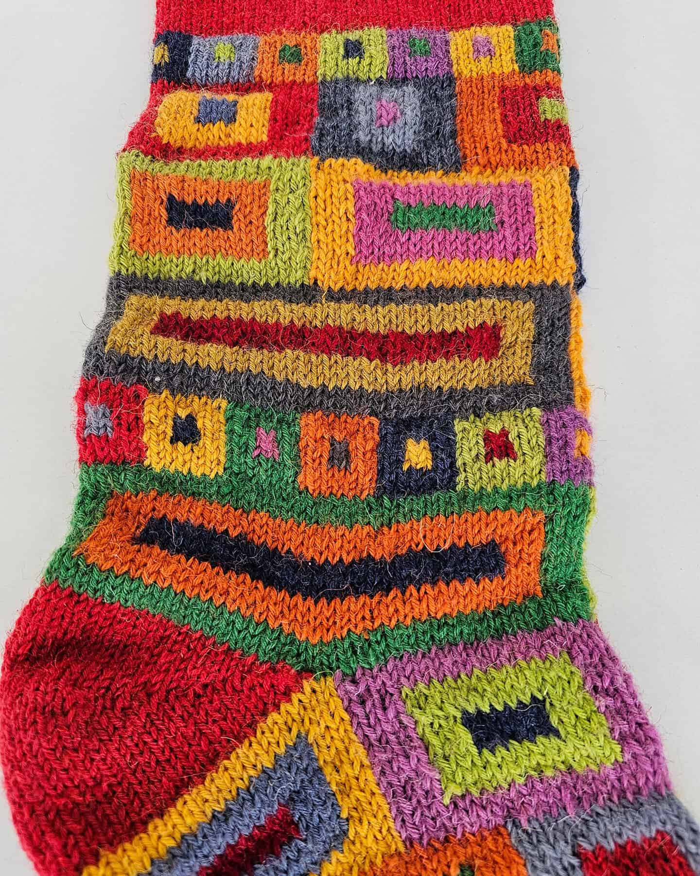 Brighten up your holiday season with this hand-knitted Christmas stocking featuring an eye-catching geometric pattern of vibrant squares as well as rectangles. Each piece is carefully handmade by BHcrafts women artisans, providing unique quality and character.