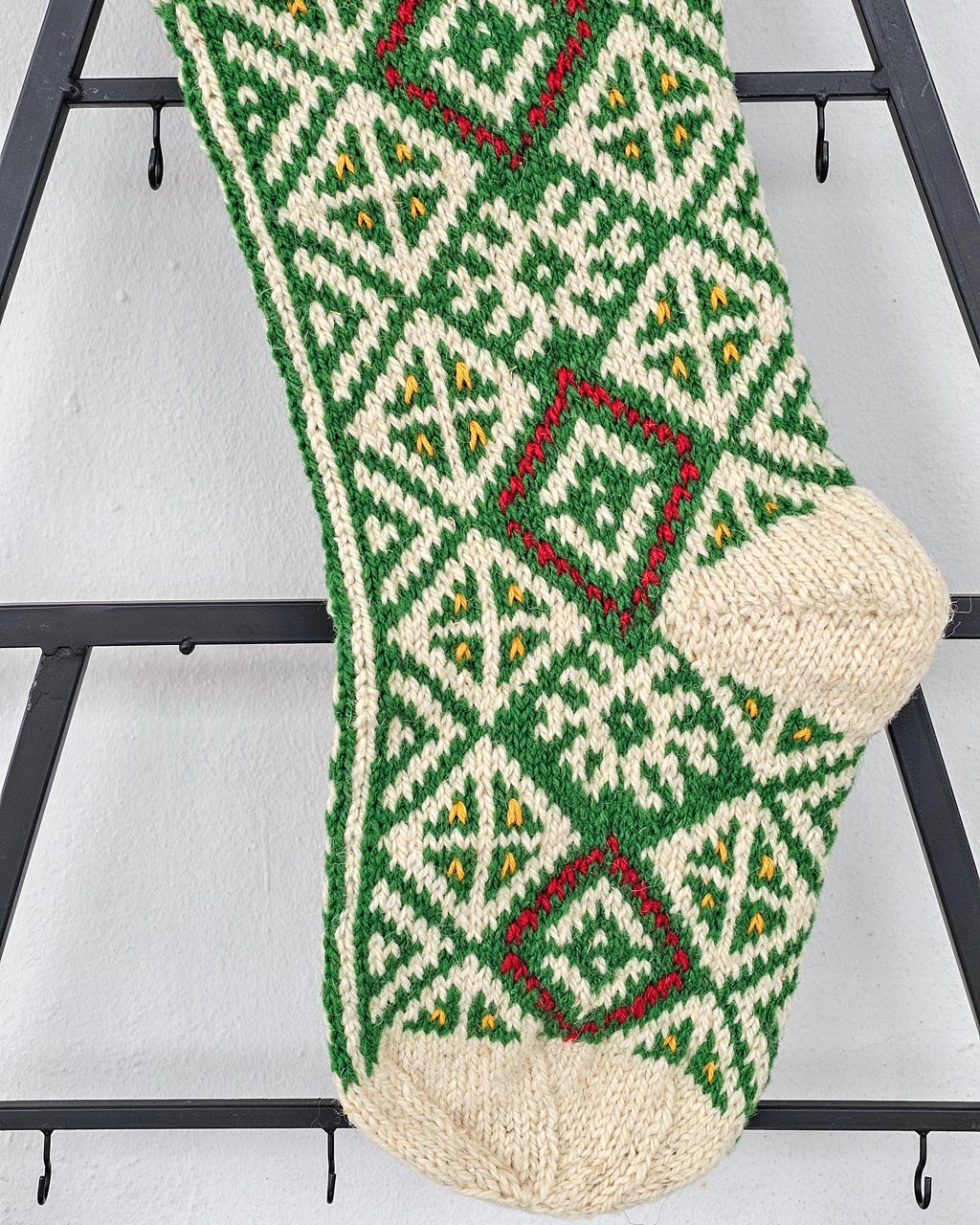 Fair trade green hand-knit Christmas stocking with traditional pattern. Add a custom name for free! Size: 23.25in x 7.1in (59cm x 18cm). Made of sustainable wool. Gift ready with eco-friendly packaging.