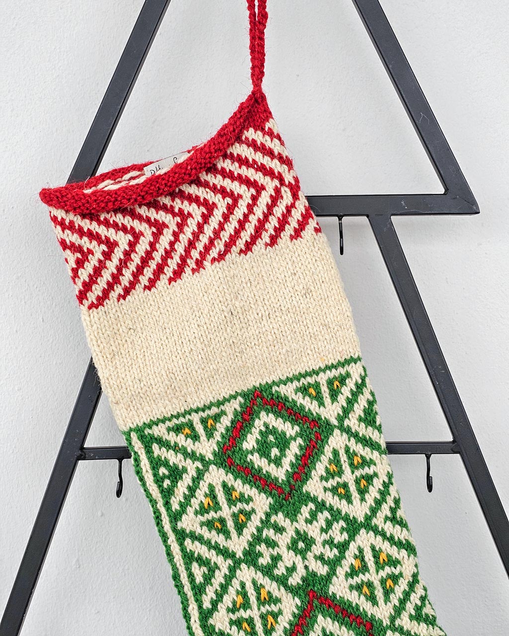 Our personalized green Christmas tree stocking is fair trade and hand-knit; therefore, it’s a perfect and meaningful holiday choice. It features a rich red and green base adorned with traditional patterns inspired by Bosnian woven rugs, as well as slipper sock motifs. Each piece is carefully crafted by women artisans, joining cultural heritage with festive charm.