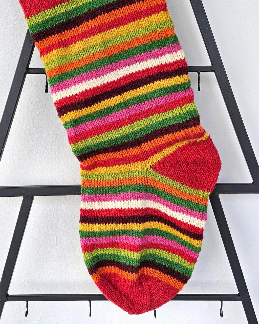 Stripes and vivid colors for a Very Merry Christmas! Hand-knit personalized striped Christmas stocking in vivid colors. Size: 23.60in x 7.00in (60cm x 18cm). Made of sustainable wool. WFTO Fair Trade, artisan-made, eco gift ready.