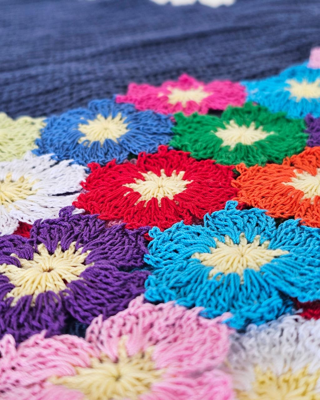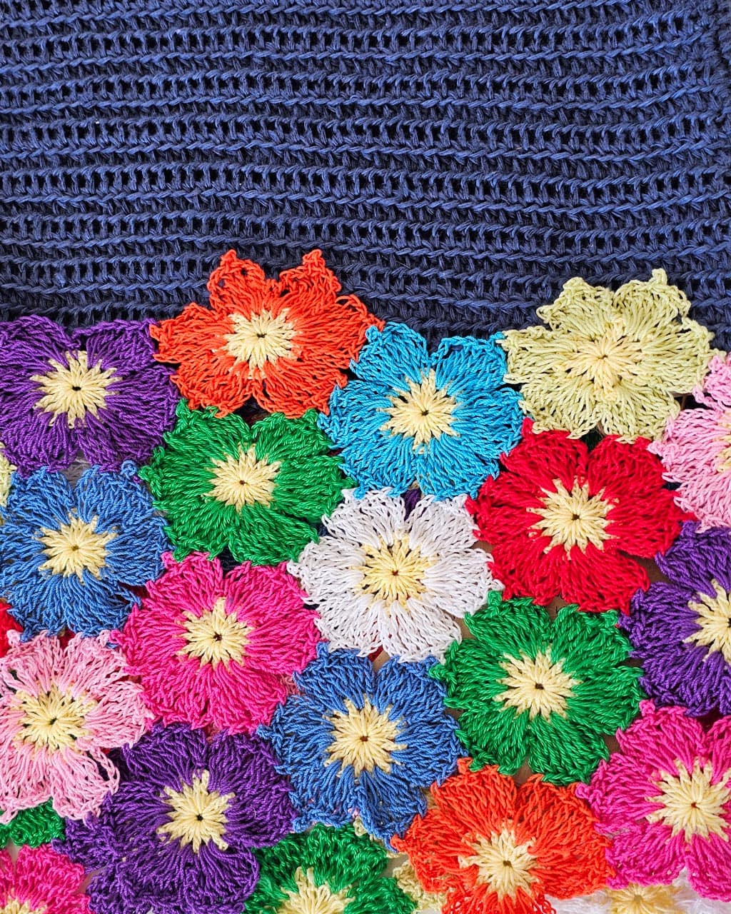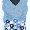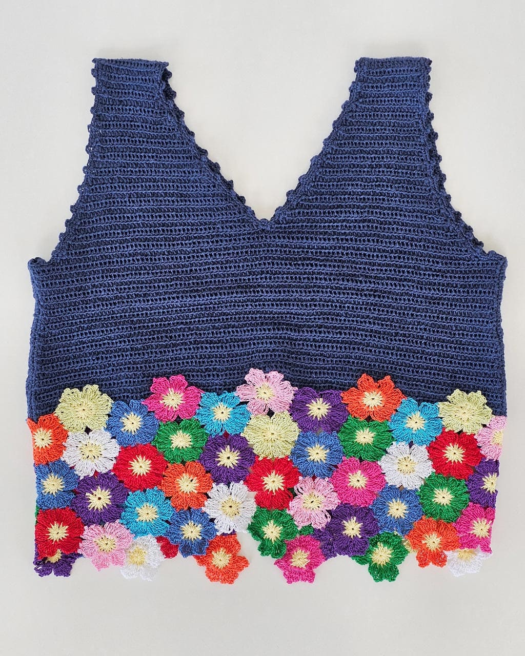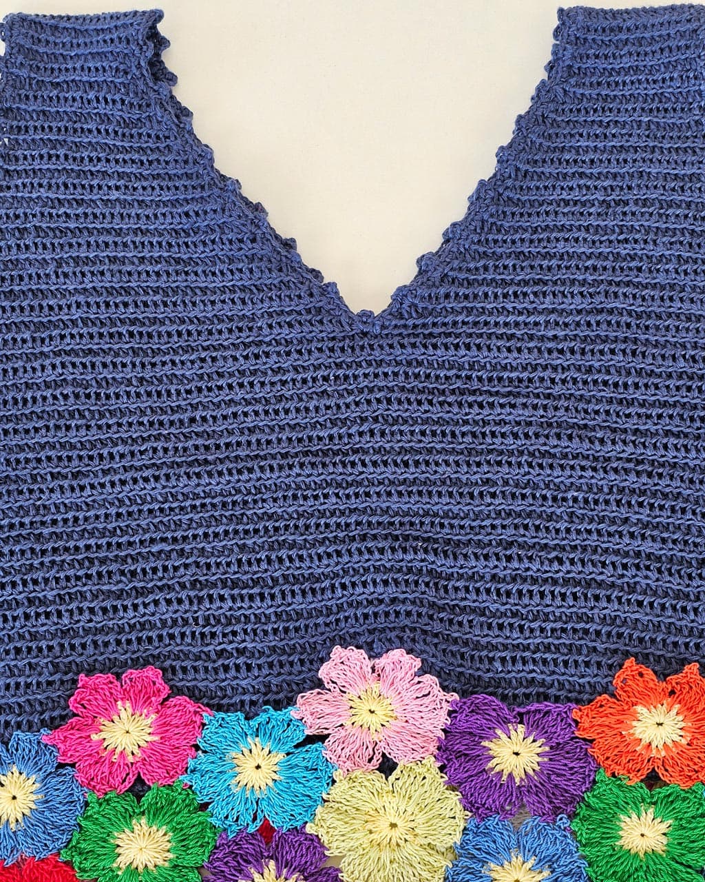 This women’s hand crocheted blouse brings color and texture into your wardrobe. The design features small floral motifs joined into a rich pattern. Each flower uses soft yarn in warm and natural tones, which creates a balanced and eye-catching look.
